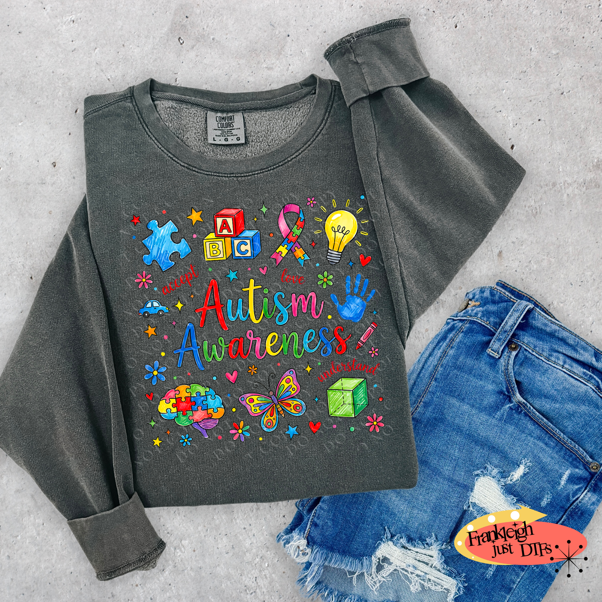 This vibrant autism awareness design features colorful puzzle pieces, ABC blocks, and a rainbow puzzle piece ribbon alongside inspirational words like "accept," "love," and "understand." The artwork includes playful elements such as a puzzle piece brain, butterfly, light bulb, handprint, and scattered hearts and stars in bright, cheerful colors. Perfect for showing support and spreading awareness with its positive message of acceptance and understanding.