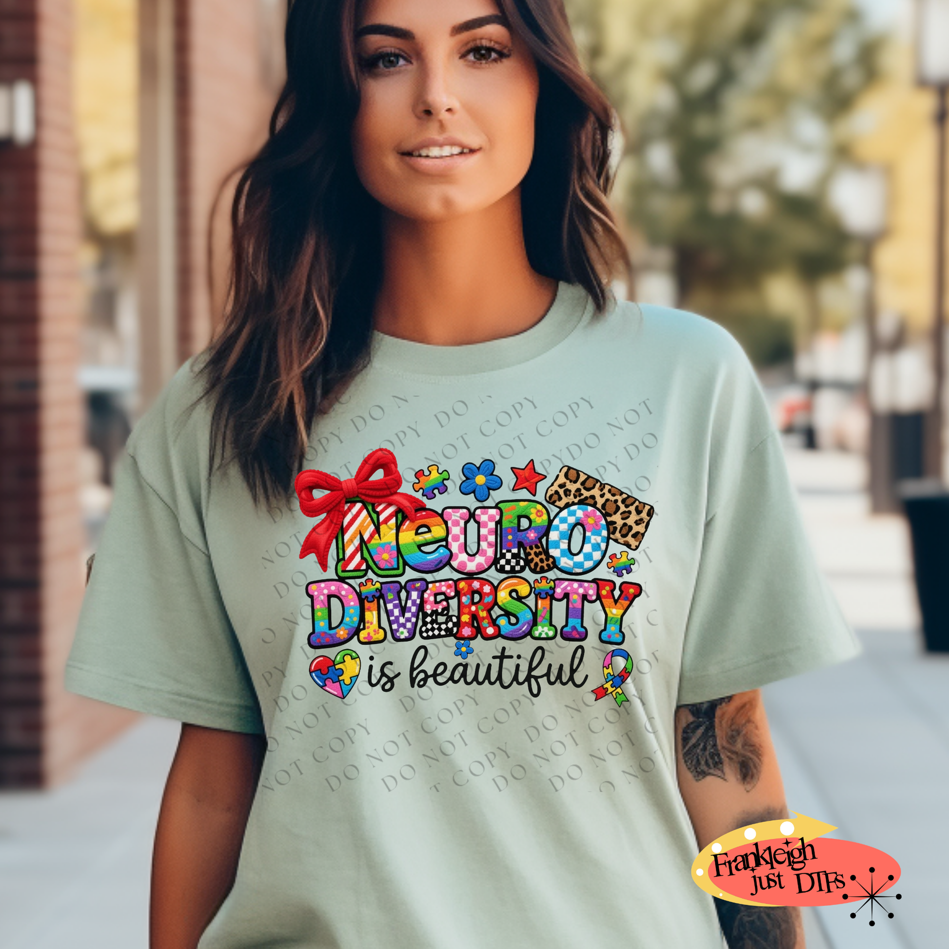 This vibrant design celebrates neurodiversity with the inspiring message "NEURODIVERSITY is beautiful" featuring colorful patterned letters filled with puzzle pieces, leopard print, flowers, and geometric designs. The cheerful artwork includes autism awareness puzzle piece symbols, a rainbow ribbon, and decorative elements like stars and flowers, all topped with a festive red bow. Perfect for spreading awareness and positivity about neurological differences and the beauty of diverse minds.
