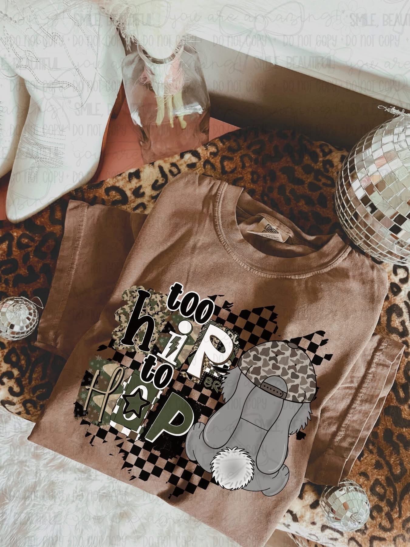 This fun design features a cartoon bunny character wearing a camouflage baseball cap, positioned alongside military-themed text that reads "too hip to hop" in a playful mix of fonts and camouflage patterns. The design combines a cute bunny illustration with army green camo elements and a black and white checkered background for a trendy military-inspired aesthetic. Perfect for anyone who loves adorable animals with an edgy, tactical twist.